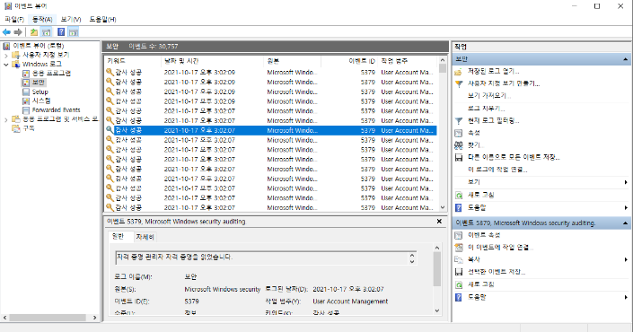 - 보안 : 로그온&로그오프 시도, 사용자 계정, 사용자 권한 등 시스템 보안 관련 이벤트를 기록함