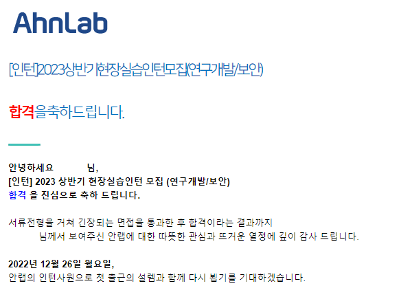 안랩 2023 상반기 현장실습인턴 서류/면접 후기후기/기타 2022. 12. 5. 20:02