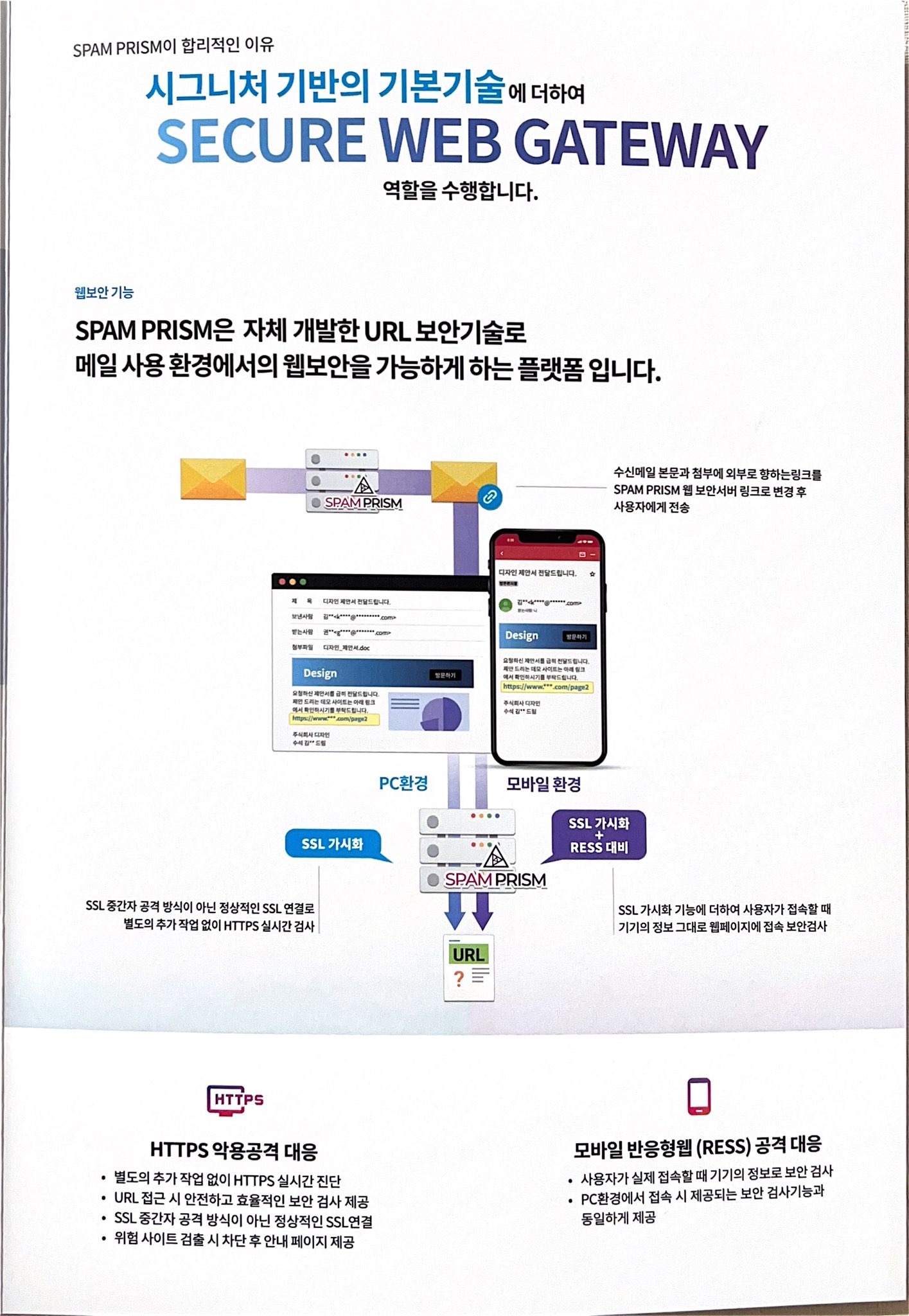 스팸프리즘은 메일에 대한 분해 및 다차원 분석이 가능하도록 실시간 SPAM필터와 APT 및 웹페이지 접근 보안 기능을 하나로 통합한 All in ONE 제품이다. 고객 PoC 및 사이트 도입 시 광고성 메일은 물론, 악성코드 배포와 사칭메일, 스캠, 피싱, 랜셈웨어와 같은 사기 및 공격성 메일까지 추가 차단하게 되어 기존 필터기반의 스팸차단솔루션에 비해 차단율이 증가한다고 한다.