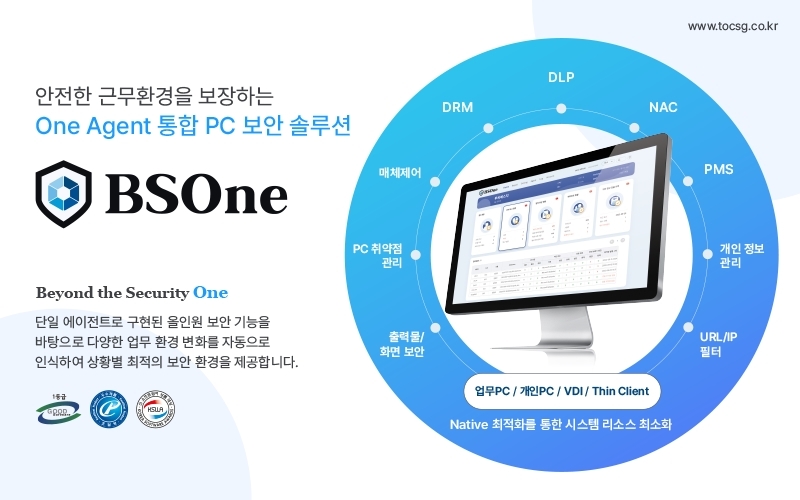 BSOne은 정보유출방지(DLP), 네트워크접근제어(NAC), PC 보안 솔루션, 화면캡처 방지 솔루션, 화면 워터마크 솔루션, USB 차단 솔루션, 출력물 보안 솔루션 등 PC 보안에 필요한 다양한 기능을 단일 에이전트로 제공하는 All-In-One 통합 보안 솔루션이다. 단일 에이전트로 구현된 올인원 보안 기능을 바탕으로 다양한 업무 환경 변화를 자동으로 인식하여 상황별 최적의 보안 환경 제공한다고 한다.