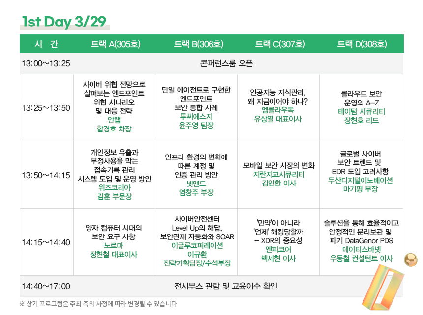 ㆍ사물인터넷(IoT)보안 : 스마트카 보안 솔루션, 융복합 보안 솔루션 등https://www.egisec.org/kor/index.html에서 사전등록 후 3월 29일 1일차에 방문하게 되었다!