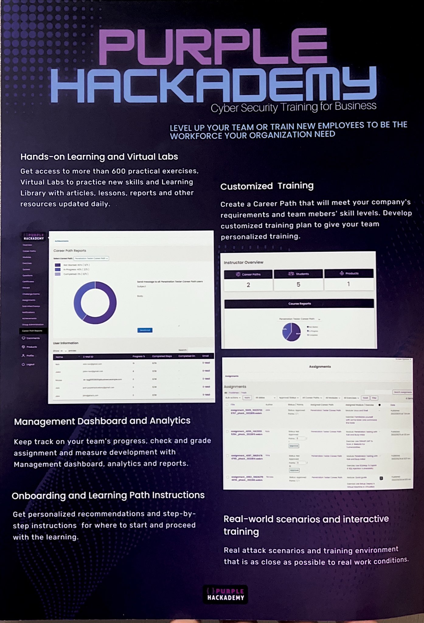 -> 온라인 사이버 보안 교육 플랫폼을 소개하고 있었는데, 해당 플랫폼을 통해 기업이 사이버 보안 팀을 구축할 수 있도록 도움을 드리고자 만들어졌다고 한다. 스킬 업과 리스킬을 위한 교육 제공하며, 회사의 필요과 직무에 따라 팀을 위한 맞춤형 커리큘럼 제공한다.