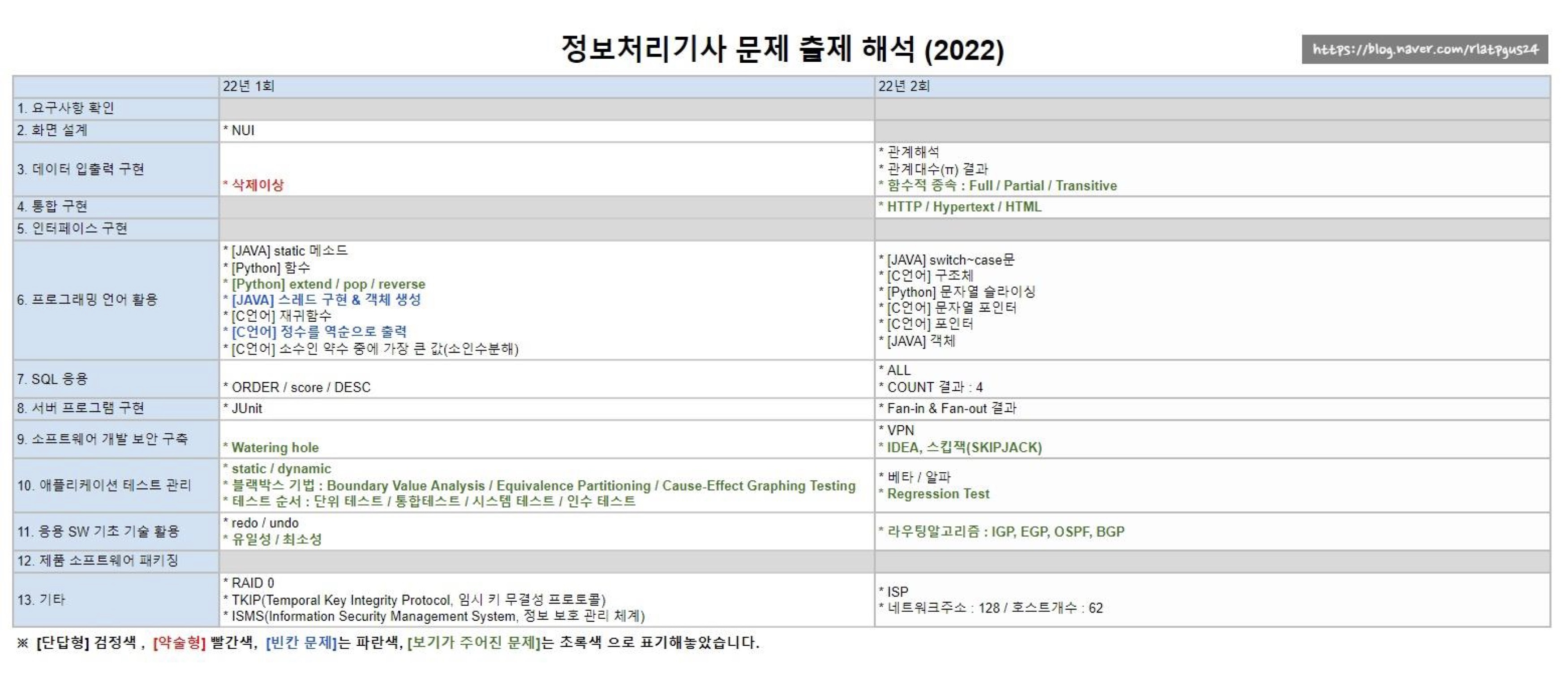 위 블로그에 들어가면 2020년~2022년에 출제된 기출 문제들을 분석해서 표로 정리되어 있는걸 볼 수 있습니다!