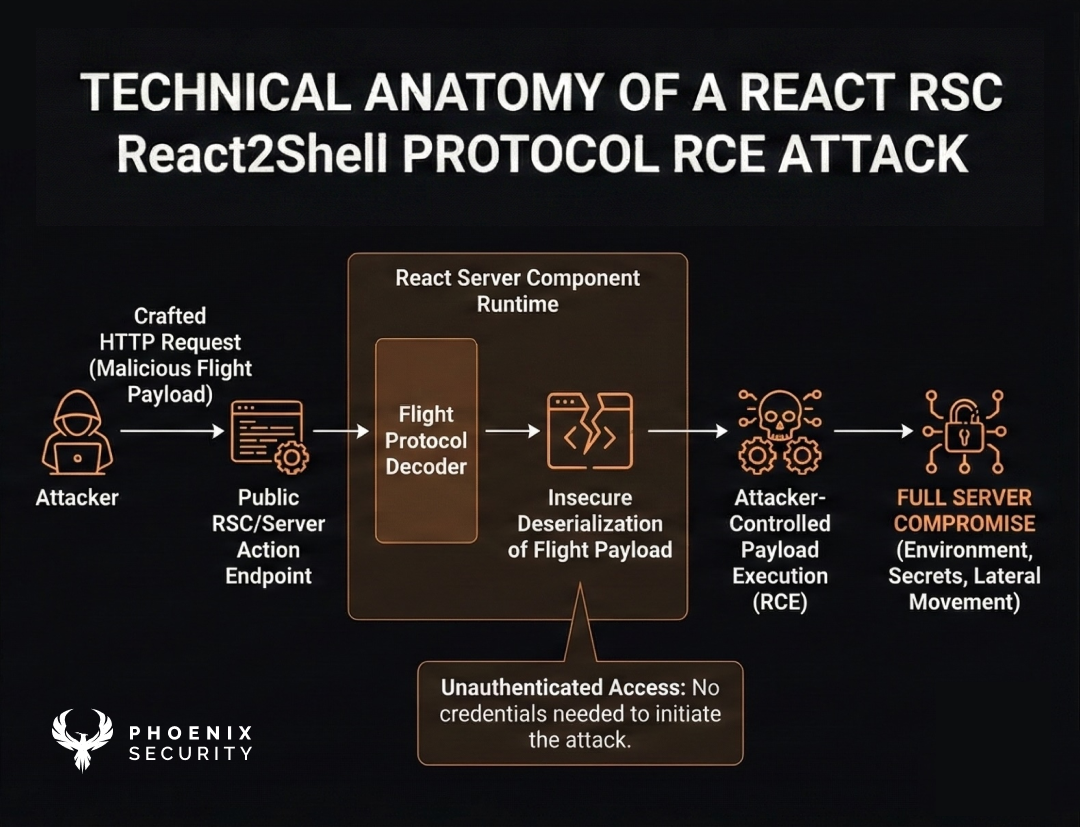 리액트 팀은 리액트 서버 구성 요소(RSC)의 중요한 인증되지 않은 원격 코드 실행(RCE) 취약점인 CVE-2025-55182를 공개했다.React2Shell 이라고 불리는 이 CVE는 CVSS 10.0 등급을 부여받았으며, 단일 조작된 HTTP 요청으로 잠재적으로 악성 코드를 실행할 수 있다. Next.js는 React에 의존하는 웹 개발 프레임워크이기 때문에 동일하게 취약하며, CVE-2025-66478을 할당받았다.